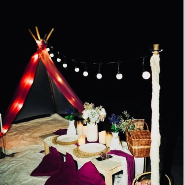 Teepee tent, cushions, rustic lanterns, and café snacks – perfect for cozy dates.
