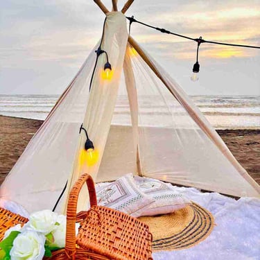 Soft pink vibes, dreamy fairy lights, and a cozy teepee by the beach 🌸✨